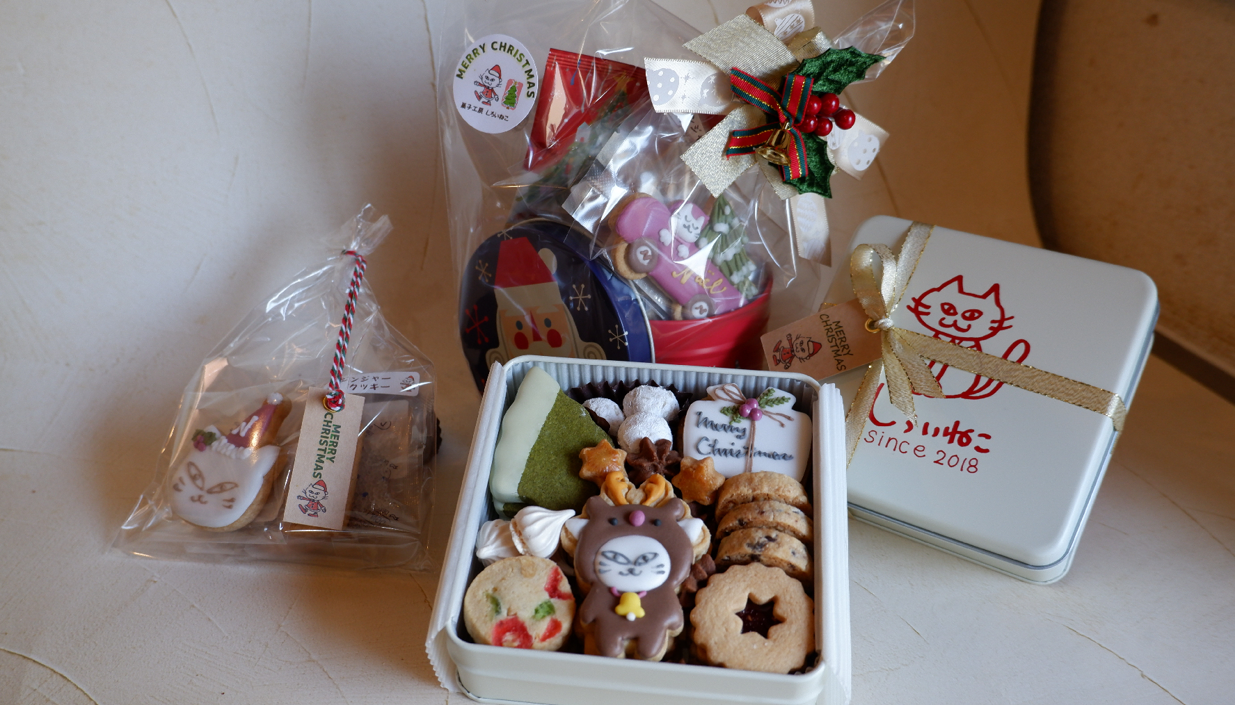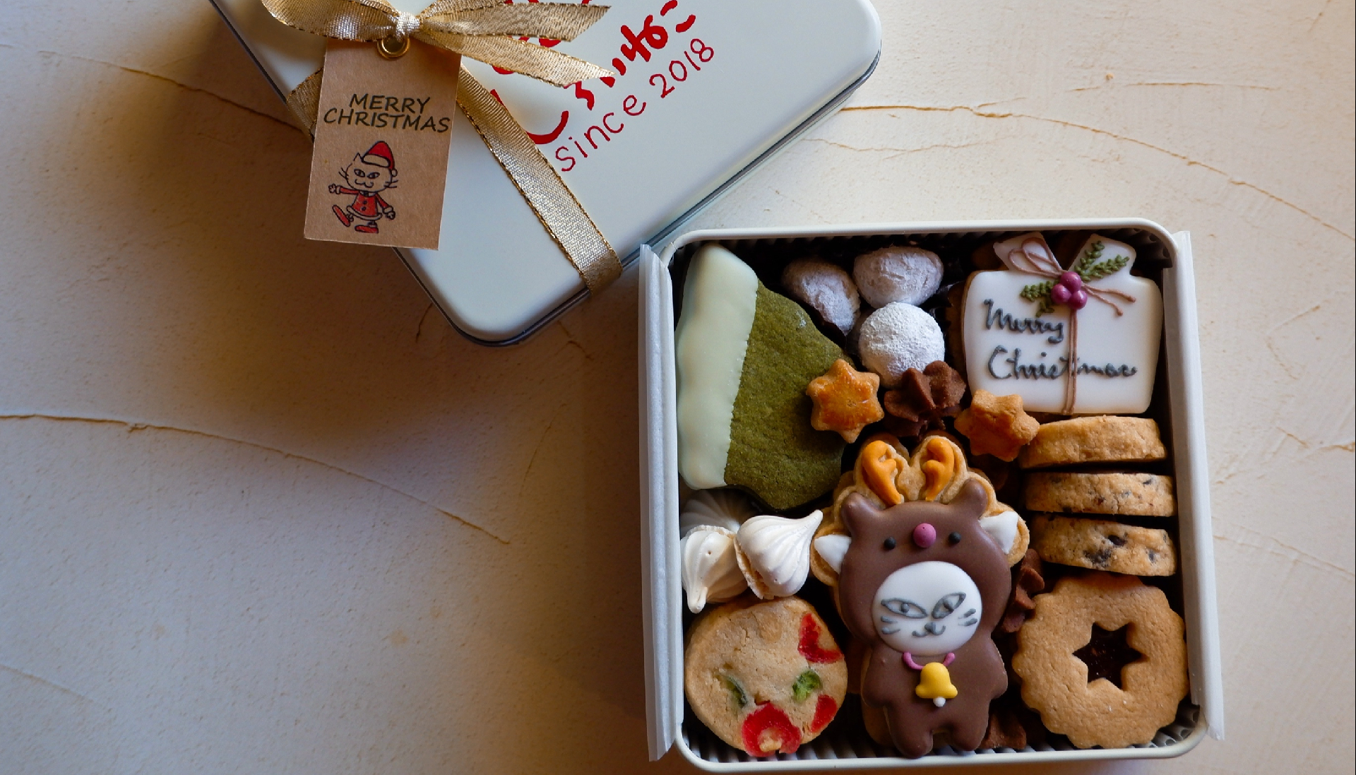 クリスマスをモチーフにしたクッキーの詰め合わせ缶。 〈缶サイズ〉12㎝×12㎝×高さ4㎝ 〈賞味期限〉2025年12月29日(未開封時)〈内容〉写真左上より時計周りに、①ツリー型の抹茶生地にホワイトチョコ掛けたクッキー、②ヘーゼルナッツ風味のスノーボール、③クリスマスメッセージアイシングクッキー(下は④ジンジャークッキー)、⑤チョコチップクッキー、⑥ジャムサンドクッキー、③トナカイニャーコアイシングクッキー(下は⑦バターサブレ)、⑧ドレンチェリーとヘーゼルナッツのクッキー、⑨ほのかに苺香るメレンゲクッキー、⑩ココアシナモンクッキー(10種30個 )