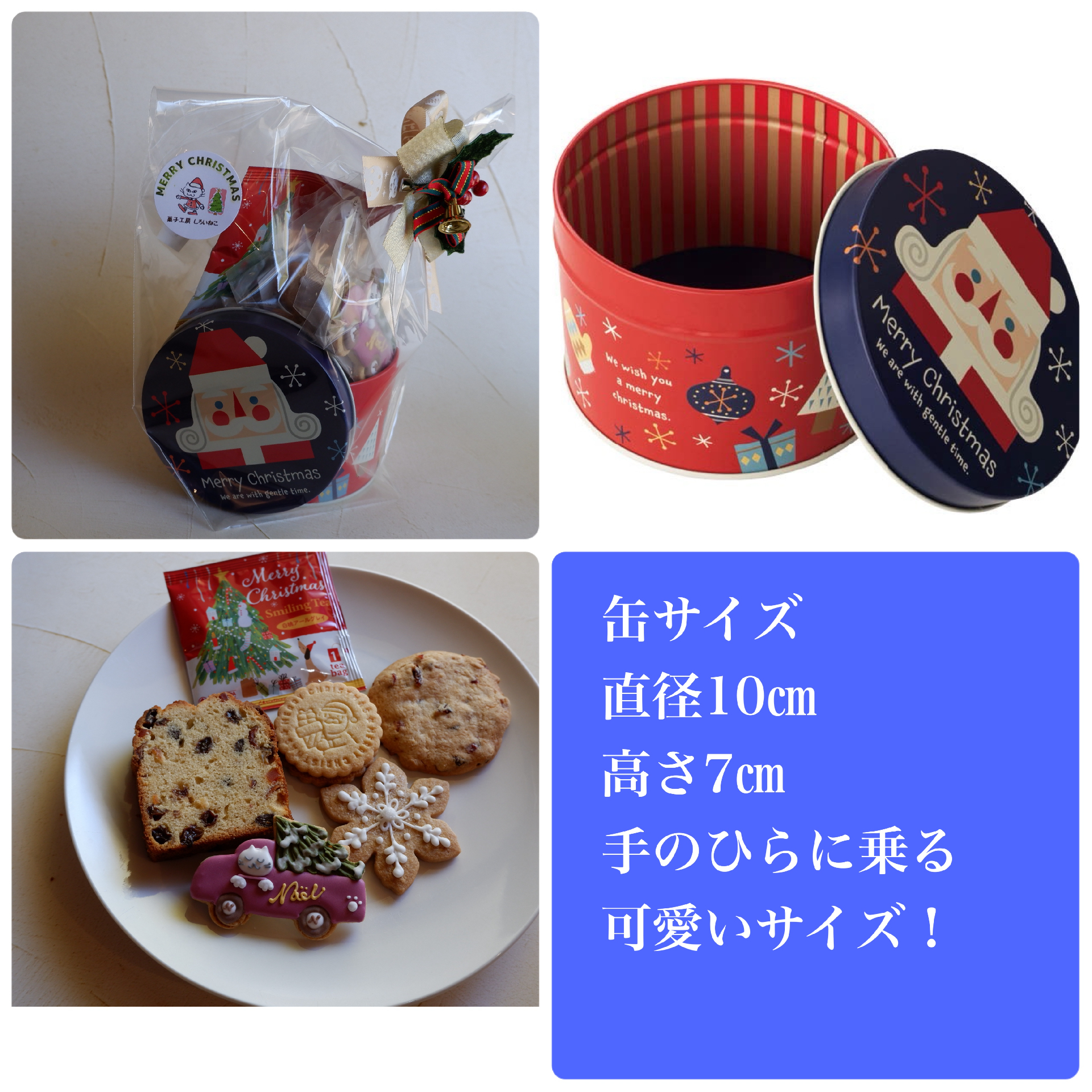 可愛い北欧クリスマス柄の丸缶に、焼菓子5個&クリスマスパッケージ紅茶の詰め合わせギフト。〈缶サイズ〉直径10㎝×高さ7㎝★手のひらに乗るサイズの可愛い缶です。 〈内容〉①クリスマスモチーフアイシングクッキー、②ジンジャークッキー、③クランベリーとホワイトチョコのクッキー、④チョコクリームサンド、⑤フルーツバターケーキ、⑥白桃アールグレイティーパック1包 〈賞味期限〉ジンジャークッキー2026年1月4日、アイシングクッキー2025年12月31日、クランベリー2025年12月28日、チョコクリームサンド2025年12月28日、フルーツバターケーキ2025年12月23日、紅茶2029年6月