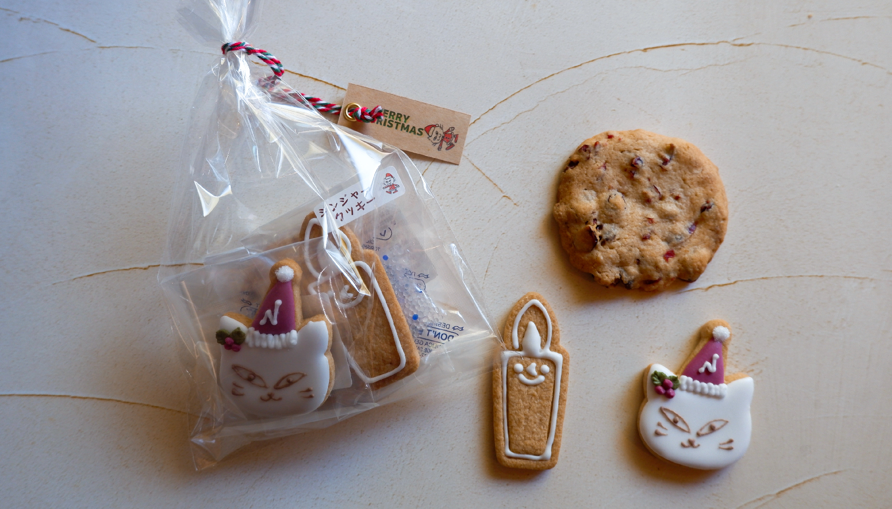 クリスマスをモチーフにした焼菓子3個の詰め合わせプチギフト 〈内容〉①クランベリーとホワイトチョコのクッキー小、②ジンジャークッキー小、③サンタニャーコアイシングクッキー 〈賞味期限〉クランベリー2025年12月28日、アイシングクッキー2025年12月31日、ジンジャークッキー2026年1月4日